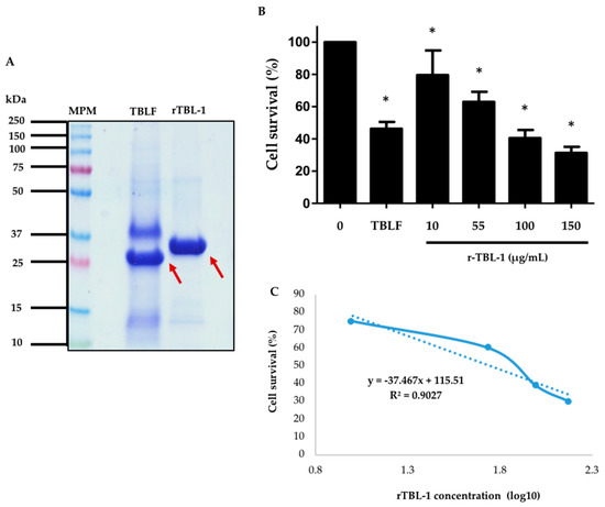 rTBL-1 quantitation with respect to the native lectin from TBLF was carried out by protein band densitometry after 13% (w/v) polyacrylamide SDS-PAGE (Figure 7A). The difference in molecular weight between the native lectin and the rTBL-1 is due to the hexa-histidine tail. It was observed that the native lectin corresponded to approximately 30% of all the proteins present in the TBLF lyophilized product, while the rTBL-1 corresponded to 80% of the total protein in the lyophilized product, and it was equivalent to 63% of the total TBLF protein. The protein concentration of rTBL-1 was adjusted to assess the cytotoxic effect of rTBL-1 with respect to the TBLF LC50 (402 μg/mL, 55 μg native lectin/mL) [3].