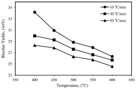 Effect of temperature and heating rate on char yields from safflower seed cake. (Reprinted with permission from ref. [24]. Copyright 2013 Elsevier.)