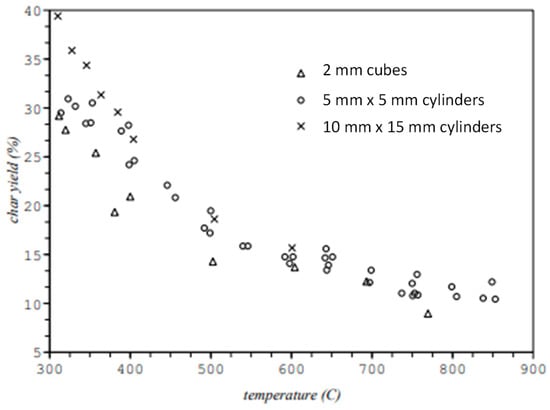Effect of particle size and temperature on char yield during pyrolysis of thermally thick particles. (Reprinted from ref. [26].)