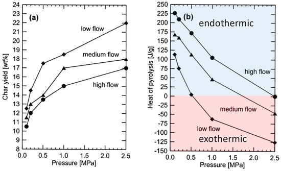 Char yield (a) and enthalpy for pyrolysis (b) as functions of operating pressure and ventilation rate during slow pyrolysis of biomass. (Adapted with permission from ref. [29]. Copyright 2014 Thermochimica Acta).
