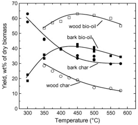 The optimal temperature for maximum bio-oil yield occurs at 450–500 °C (Reprinted with permission from ref. [35]. Copyright 2013 Fuel).