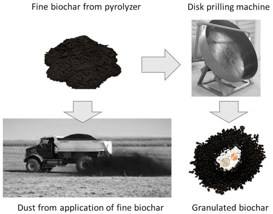 One of the major challenges of biochar as carbon sequestration agent is lack of uniform properties among biochars, which are dependent on the feedstock and pyrolysis conditions. For example, the high ash content of herbaceous biomass results in biochars with lower fixed carbon content than woody biomass [46], reducing its carbon sequestration potential per unit mass. Biochar produced at lower temperatures and shorter solids residence times contain more volatile matter (labile carbon) [53], which very quickly mineralizes in soils and does not contribute toward long-term carbon sequestration [54]. Biochar production often yields a fine powder (see Figure 8), which can be difficult to apply on fields and can even be a fire hazard. However, this problem can be largely mitigated through prilling the biochar with a small amount of binder material into granules, as shown in Figure 8.