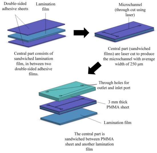 - Chen, X.; Li, T.; Gao, Q. A novel method for rapid fabrication of pmma microfluidic chip by laser cutting and sealing integration. Surf. Rev. Lett. 2019, 26, 1950042. [Google Scholar] [CrossRef]
