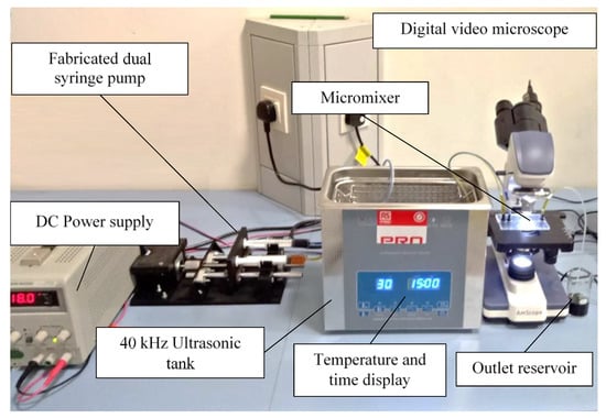 Figure 4 shows a schematic diagram of an experimental setup, which includes a micromixer, digital video microscope, fluid driving mechanism and ultrasonic tank with temperature control. 3D printer was used to fabricate a dual syringe pump to drive two streams of coloured solutions into the separate inlet arms of T-, Y- and Dean micromixers with an equal flow rate. Food grade dyes were diluted with deionized water with ratio of 1:25 to produce these yellow and blue coloured solutions. The viscosity and density of the coloured solutions are assumed similar to deionized water. The coloured solutions inside both syringes were driven by a NEMA 17 stepper motor, connected with a lead screw and guided with two steel rods. A4988 motor driver was used to drive the stepper motor, and Arduino UNO as the controller. The A4988 motor driver was used to increase the resolution step from 200 to 3200 for a single rotation. Additionally, the dual syringe pump system was connected with a DC power supply (GPS-3030D, Good Will Instrument Co., Ltd., New Taipei City, Taiwan). Image acquisition was performed at 4× magnification using a digital video microscope (MD500, AmScope, Irvine, CA, USA). The captured mixing images were post-processed using MATLAB software to compute their respective mixing indices using Equation (1). The schematic diagram for the experimental setup is shown in Figure 5.