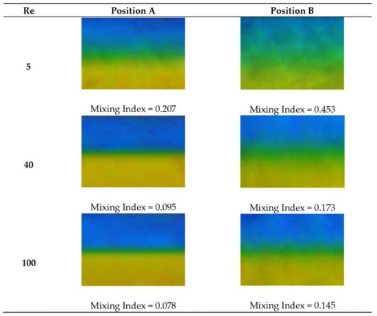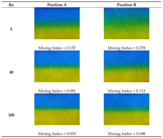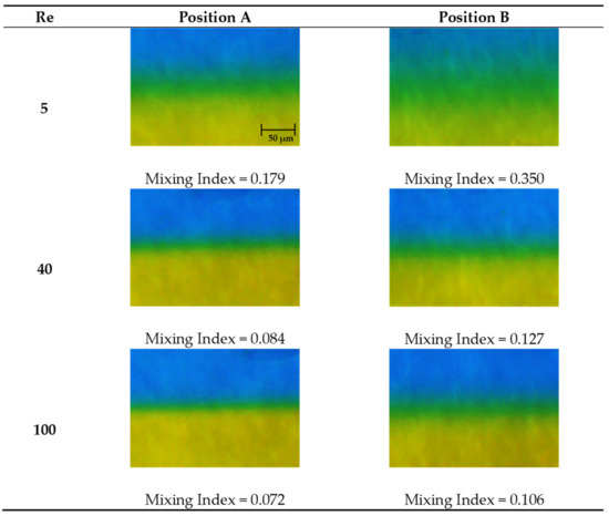 Qualitative experimental mixing images for T-, Y- and Dean micromixers along the straight microchannels are presented in Figure 6, Figure 7 and Figure 8, respectively. Initially, the two dissimilar fluids underwent mixing at the junction before flowing into the straight mixing channel. A distinctive narrow region of mixed solution (green coloured) can be observed along the straight microchannel. Mixing index at position B is higher in comparison to position A due to enhancement of mixing behaviour as the fluids flow downstream [35,42]. It can be observed that the mixing occurred the most at the centre of the microchannel due to symmetrical nature of the channel contributed by diffusive mixing mechanism [43].