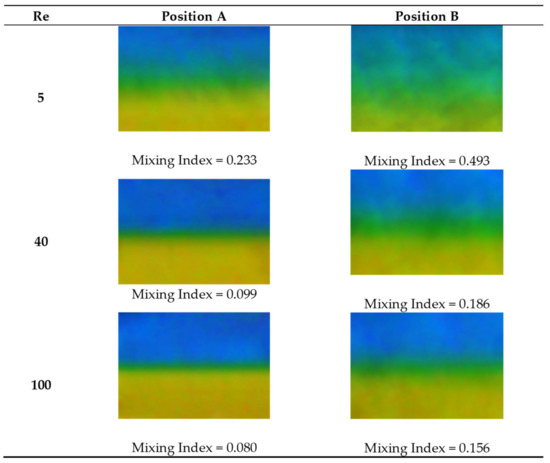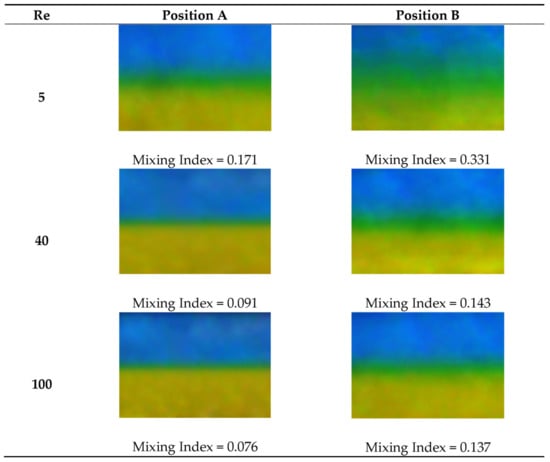 Figure 9 compares quantitative mixing indices of T-, Y- and Dean micromixers at position B for 5 ≤ Re ≤ 100 in the absence of ultrasonic excitation and thermal energy. Three mixing indices of T-micromixer for Re = 5 at room temperature have been computed (MI = 0.3501, 0.3505 and 0.3492). The average value and standard deviation for the sample are 0.3499 and 0.00067, respectively. Because the standard deviation is insignificant, only one measurement was taken for each Reynolds number at different operating conditions [36]. A clearly similar mixing trend can be observed irrespective of the inlet geometrical designs, as the mixing enhances with a decreasing Reynolds number. All three micromixers have a relatively higher mixing index at a lower Reynolds number attributed to increased molecular diffusion due to higher residence time [44]. This corroborates well with the findings reported in [45,46] for Re < 150.