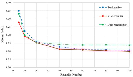 It is noted that the T-micromixer demonstrates marginally higher mixing performance as compared to Y- and Dean micromixers for 5 ≤ Re ≤ 20. This is because the effect of molecular diffusion is more pronounced than the effect of Dean flows. In the curved microchannel (see Figure 1a), higher velocity magnitude at the channel centre has the tendency to move outward of curvature, creating a radial pressure gradient. Because of this centrifugal pressure gradient, the more stagnant fluid at near-wall region would re-circulate inward, forming two counter-rotating vortices called Dean vortices with different magnitude depending on the microchannel radius of the curvature [47]. Hence, fluids originating from two dissimilar geometrical inlets having different Dean numbers causes an unbalanced collision of the secondary flow (Dean vortices), and the Dean effect on mixing index becomes more significant at Re > 20 [20,47]. This agrees well with the earlier study by Shah et al. [17] who found that the effects of Dean number on mixing is more apparent at higher Reynolds number since Dean number is proportional to Reynolds number (see Equation (4)). For this reason, the Dean micromixer exhibits higher mixing performance (about 27% better) than the T- and Y- micromixers for 40 ≤ Re ≤ 100.