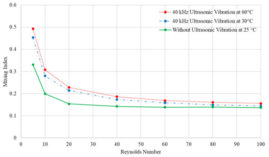 It can be observed that the ultrasound and thermal effects on mixing performance is more significant at 5 ≤ Re ≤ 20 because of increased residence time [7,11]. Due to increased residence time, the external energies transmitted responsible for the mechanical effects within the system are prolonged, increasing mass transfer between these mixing fluids [50]. It has also been found that the mixing index increased by about 6% to 10% at various Reynolds numbers once the sonicated mixing fluids were heated from 30 °C to 60 °C.