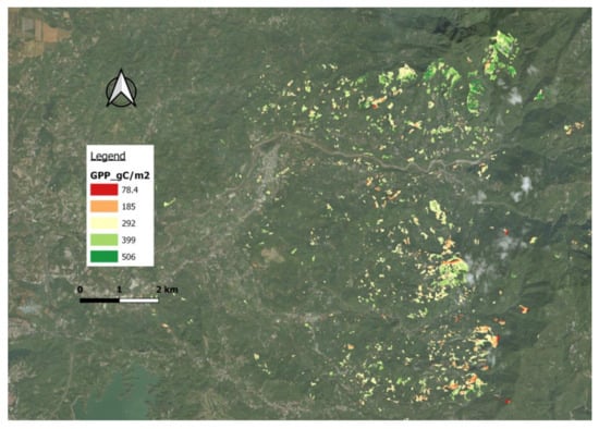 To better understand the regional pattern and largely quantify the GHG dynamics, we used process-based models that included climate and plant physiology data and provided a tool to assess carbon sink under varying environments and spatial scales. To achieve this goal, we integrated a modeling and remote sensing approach. The process-based models provide an interesting way to analyze the absorption capacity of a large area in variable environmental conditions and over a range of different spatial scales []. Satellite remote sensing represents a tool that can potentially upscale the spatial range provided by punctual measures. Due to the limited coverage of the ground measurements, the interest in remote sensing use for the estimation of GPP is increasing [,]. Many models based on remote sensing application have been proposed to quantify the GPP; as they are simple, most of them are linear and efficient [,,]. Remote sensing GPP models are grouped in four principal categories: light use efficiency (LUE) [,], vegetation index (VI) driven [,], process-based [], and machine learning models [,].