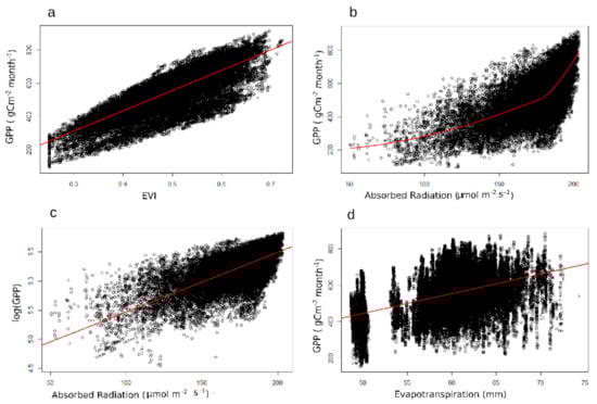 Representation of the GPP variability as a function of EVI (a), absorbed radiation (b,c), and evapotranspiration (d).
