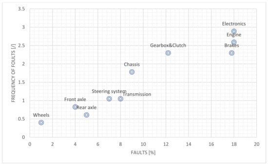 Data were obtained on a sample group of identical buses (N = 100) over a period of T = 10 years, with the total number of failures being n = 80. An exponential breakdown of accident randomness for the vehicle, as well as for key in-vehicle components and systems, was assumed. Figure 1 shows the distribution and frequency of faults more clearly in graphical form.