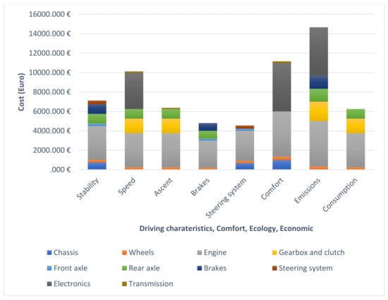 From the analysis of function forms A2 to C2 in the matrix, we can see that the functions A2—Speed and C1—Emissions are the most expensive. For example, when we try to find ways to reduce production, use, and servicing costs for the C1 emission function, it is relatively easy to find that it has the highest cost–benefit ratio. At the same time, it is also the most expensive feature. This means that it is necessary to make changes in terms of reducing costs and thus improve the cost–benefit index [6,7].