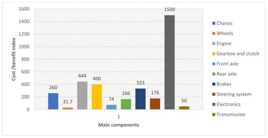 The XFA method enable the traceability of changes in a vehicle’s aggregate structure and functions. Table 1 and Table 2 show the level of importance of the engine and wheels: 1, electronics—2, etc. Only selected system functions and accompanying assemblies are essential. The cost–benefit analysis matrix (Table 4 and Figure 3), which also contains the prices of sets and the cost–benefit index, shows a significantly different picture. The wheels have the best cost–benefit index (31.7) and level of importance (1), and the motor has a cost–benefit index of 444 and level of importance 9, etc.