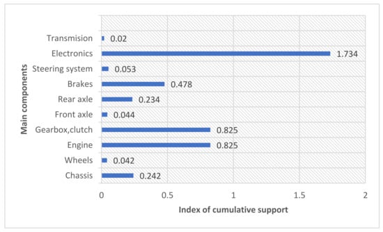 Table 6 and Figure 4 show the support index. It is achieved by multiplying the data and represents the sum of the values in each row. Most of the problem’s relations to reliability and maintenance are in the engine, electronics, gearbox and clutch, and brakes; this was also expected. In terms of functions, the biggest expected problems relate to speed, comfort, emissions, and braking.