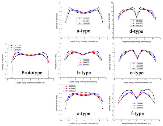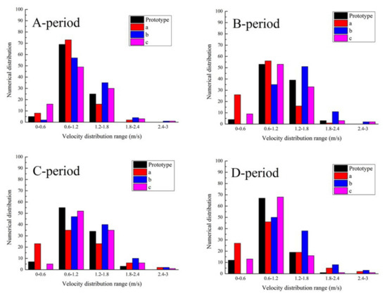The velocity distribution at the bottom of the chimney is shown in Figure 16. As it can be seen from the figure, the measured velocity distributions in SCPPS with the different types of baffles are very different. The velocity of b-type baffles is concentrated in the range of 1.2 m/s above. In the experiment conducted in period B, the velocity distribution in SCPPS with b-type baffles in the range above 1.2 m/s accounted for 64.6%, and the velocity distribution in SCPPS with prototype, a-type and c-type baffles is 42.4%, 17.2%, and 38.4% respectively, which are much lower than that in SCPPS with the b-type baffle. In the A, C and D periods, the velocities in SCPPS with b-type baffles above 1.2 m/s accounts for 40.4%, 52.5%, 49.5%, respectively, which are higher than the velocities in other cases.