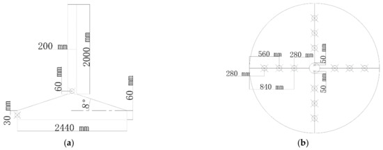 In view of the size of the experimental apparatus and conditions, the baffle is made of 4 mm acrylic. Three types of baffles, a, b, and c, are tested. The shapes and sizes are shown in Figure 6a. The distribution in the system is shown in Figure 6b.