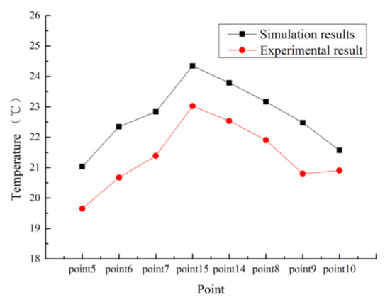 It can be seen from Figure 8 that the temperatures shown by the simulation are higher than the temperatures measured in the experiments. The stable boundary conditions are used in the simulation without regard to the influence of environmental factors, so the overall temperature distribution in the simulation is higher than the temperature measured in the experiments. It is concluded that the temperature difference is 7.5% at most, 3.1% at least, and 5.9% on average. It is shown that both of the temperature distributions are the similar, which is gradually rising from the entrance of the collector to the entrance of the chimney, and the temperature at the bottom of the chimney is the highest. Thus, the experimental results can be considered to be reliable.