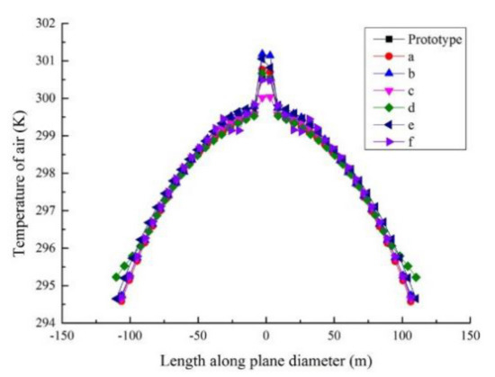 In the SCPPS the air under the collector is mainly heated by absorbing solar radiation energy. The higher temperature of the air in the system, the more output power improved of the system. The ZOX plane at 1 m was taken under the collector, and compared with the temperature distribution of the system without baffles. The distributions of temperature in SCPPS are shown in Figure 9. It is shown that the temperature of the air rises gently from the entrance of the collector to the central chimney, and higher temperatures appear at the center of the chimney entrance. The entrance temperature in SCPPS with a-type baffles is the lowest, which is 294.6 K, while that with d-type baffles is the highest, which is 295.2 K, with a difference of only 0.6 K. The highest temperature of the plane in SCPPS with c-type baffles is the lowest, which is 300.0 K, while that of b-type baffles is the highest, which is 301.2 K, with a difference of only 1.2 K. The differences are tiny. Thus, the temperature distributions in SCPPS with different type baffles are similar.