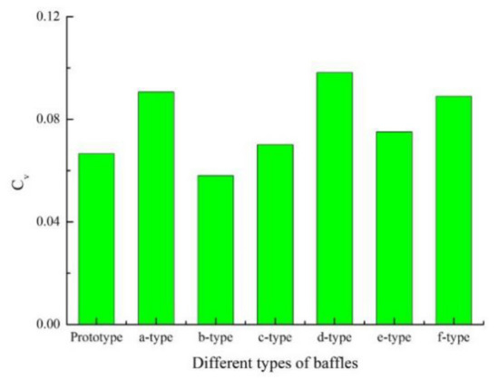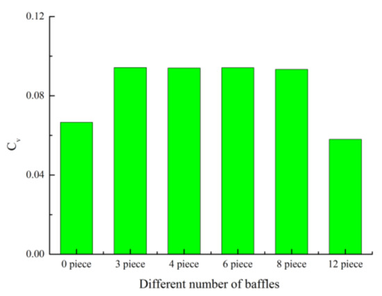 The relative velocity standard deviation is used to quantify the stability of the flow field, and the stability of the flow fields in the systems with different numbers of b-type baffles is compared. The results are shown in Figure 13. It is shown that as the number of baffles increases, the flow field uniformity first decreases and then increases, and the Cv first increases and then decreases. When the number of baffles is 3, the relative velocity standard deviation is the largest, which is 0.0943. According to the above-mentioned Cv judgment standard, the stability of the flow field in SCPPS with three baffles is at the optimal stage, but its uniformity is the worst, compared with no baffle and 12 baffles, the difference rate of both is 29.4% and 38.4% respectively. Therefore, it is observed that the number of baffles has an expressively influence on the stability of the flow field, and the Cv with 12 baffles is optimal.