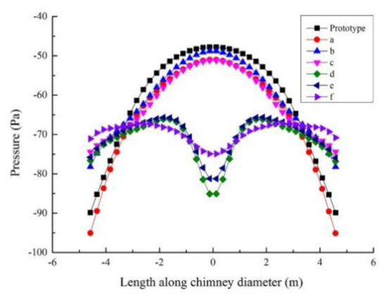 The pressure distribution at the turbine blades sweeping plane in SCPPS with different numbers of b-type baffles is shown in Figure 14. It can be clearly seen from the figure that the pressure variation is almost the same, and the pressure increases from the inner wall of the chimney toward the center of the chimney. Compared with the pressure distribution in SCPPS without a baffle, the maximum negative pressure at the turbine blades sweeping plane in SCPPS with baffles is lower than that of prototype. When the 12 pieces of baffles are used, the maximum value of negative pressure is −78.241 Pa, and the maximum value of negative pressure of prototype is −89.837 Pa, with a difference of about 12.9%. Nevertheless, different numbers of baffles have little effect on the pressure distribution at the turbine blades sweeping plane. The maximum negative pressure does not exceed 5%, and the minimum negative pressure does not exceed 1%. The overall pressure distributions are very similar.