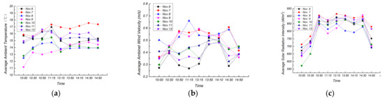 The ambient experimental data. (a) Average ambient temperature; (b) Average ambient wind velocity; (c) Average solar radiation intensity.