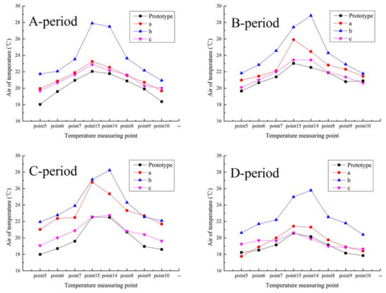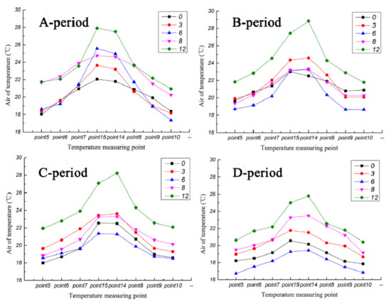 It can be seen from Figure 15 that in different experimental days, the data of the average ambient temperatures, average ambient wind velocities, and average solar radiation intensities in the four time periods are relatively similar. The maximum differences of the average ambient temperature or average wind velocities do not exceed 20%. The maximum difference on average solar radiation intensities is 16.7%, and the minimum difference is 10.8%. The free outdoor experimental environment is regarded as the same environment, and the experimental data in some period is taken for analysis. The taken experimental stages were classified into A, B, C and D-period. The experimental periods are shown Table 7. The pressure differences we tested are small, so we will not discuss the pressure here.