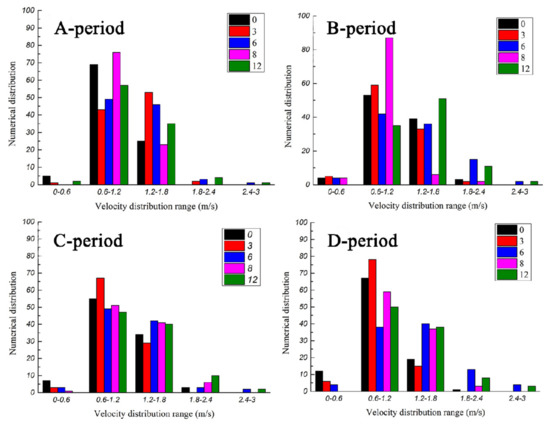 According to experimental data, different numbers of b-type baffles have different effects on the velocity changes at the bottom of the chimney, and the velocity distribution is shown in Figure 18. It can be concluded that in period B and C, the velocities in the system with 12 b-type baffles are concentrated above 1.2 m/s, accounting for 64.6% and 52.5%, and when the number of baffles is 0, 3, 6, and 8, accounting for 42.4% and 37.4%, 35.4% and 29.3%, 53.5% and 47.5%, and 8.1% and 47.5%, respectively. In period A, the velocities in the system with 3 b-type baffles are concentrated above 1.2 m/s accounting for 55.6%. At this time, when the number of b-type baffles is 0, 6, 8, and 12, the velocities are 1.2 m/s or more accounted for 25.3%, 50.5%, 23.2%, and 40.4%. In period D, the velocity distribution in the system with 6 b-type baffles is above 1.2 m/s accounting for 57.6%. Meanwhile, when the number in the system with b-type baffles is 0, 6, 8, and 12, the velocities are 1.2 m/s or more accounted for 20.2%, 15.2%, 40.4%, and 49.5%. As mentioned above, it can be seen that the different experimental time and numbers of baffles have different effects on the velocity at the bottom of the chimney. Under the condition of weak solar radiation, 3 or 6 b-type baffles can increase the concentrated distribution of the velocities at the bottom of the chimney, which means increasing the velocities. In the case of strong solar radiation, 12 b-type baffles are more conducive to the velocity increment at the bottom of the chimney. Compared with other numbers in the system with b-type baffles, 12 b-type baffles can force the system maintain a relatively uniform and stable velocity distribution all the experimental time.
