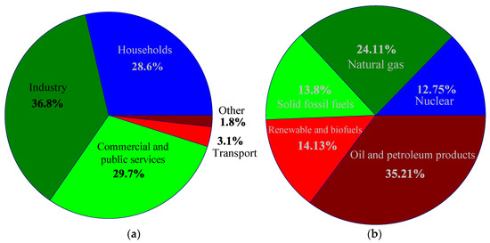 Classification of final electricity consumption in 2017 (a) by sector and (b) primary energy consumption in 2017 by fuel type in the case of EU-28.