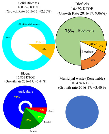 Biomass is among the most available, renewable energy sources on the planet. This non-fossilized and biologically degradable material is either created from plants, species, and micro-organisms, or it can be derived from products, by-products, and wastes [10]. There are various types of biomass feedstocks available in Europe, including dedicated crops and wastes and residues. Sugar crops, oil crops, starch crops, algae and aquatic biomass and lignocellulosic crops are in the dedicated crops category, while waste gases, organic residues, oil-based residues and lignocellulosic residues are in the wastes and residues category. Bioenergy is defined as the energy derived from the conversion of biomass, where biomass can be used directly as fuel or processed into liquid and gaseous forms. It is one of the most versatile RES that can be used in different forms (solid, liquid, and gaseous) for different applications (power, heat, and transportation). To this end, its application has seen a significant increase, particularly in the heating sector. In Europe, the installed capacity of bioenergy has expanded by approximately 180% over the past decade [11,12]. This source of energy is responsible for 9% and 16% of total electricity and heat generation, respectively [13]. Today, biomass remains one of the largest and primary RES around the world, due to its wide-spread use, renewability, and versatility [14]. In terms of availability and generation rate, solid biomass, particularly woody plants, encompass the largest portion, while biogas and biofuel come second and third, respectively [15]. According to “Bioenergy Europe”, woody biomass takes 70% of all available feedstock for energy generation in EU-28, whereas this value is only 18% for agricultural biomass and 12% for bio-waste (Figure 2). Further, this database indicates that the utilization of biomass takes place mostly in the industrial sector for heating purposes. Almost three-quarters of the supplied feedstock was exploited for heating supply and the remaining for electricity generation and transportation fuels [16]. Currently, bioenergy is the first choice of RES in many countries and remains the core of the future energy mix, especially in EU-28. Provided that the bioenergy developments in EU-28 are increasing massively, maintaining economic competitiveness regarding biomass supply and demand mismatches is the primary challenge in this continent. From environmental damages and biodiversity destruction to lack of incentives and regulations, bioenergy requires research attention, financial investments, and firm policies. Over the past 20 years, this source of energy has been considered the most promising solution to the challenges associated with the development of clean generation and a profitable “green energy market” [17].