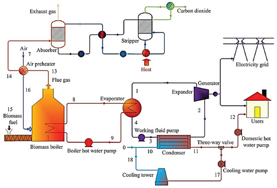 Schematic diagram of biomass-fired ORC-CHP system integrated with MEA-based CO2 capture [67].