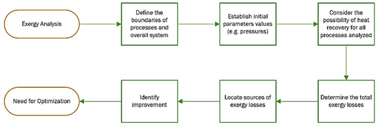 Energy analysis can be defined as a means to assess energy utilization in an operation engaging in physical and chemical processes. It can be expressed as the quantification of energy flow into and out of a system [46]. On this account, this analysis cannot be considered a powerful option to identify and locate energy losses within a system. The separation of useful work from irreversibility and determining the associated energy-loss sources is a great approach toward evaluating an energy system from different aspects; hence, in search of defining the useful work in a process, the ‘exergy’ concept was described [47]. This phenomenon is based on the second law of thermodynamics and it is of the utmost importance in and of itself, which expresses the availability of energy (Figure 4) [48]. In generation plants, maximizing efficiency and minimizing energy destruction are the two primary necessities in which exergy evaluation plays a key role. Exergy analysis is a promising technique for determining exergy efficiency and quantifying energy dissipation so that possible options for enhancing efficiency can be identified [49]. Over the past few decades, this method of assessment has been studied comprehensively due to its numerous advantages over the energy balance approach (energy analysis). Interestingly, this analysis gained prominence for its performance evaluation, comparison, improvement, and optimization across different sectors. Some of the most significant benefits of exergy analysis can be summarized as follows [50]: