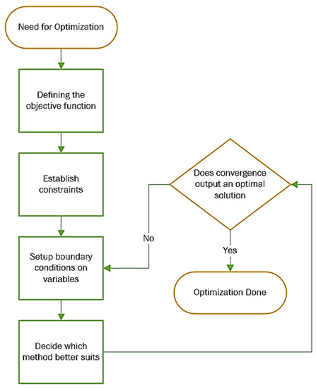 The operation of every energy system is associated with losses and imperfections. To achieve optimum performance, considering the objective functions, energy dissipation should be taken into account, and optimization of the operation should be conducted in terms of economic, thermodynamic, and/or environmental aspects. Following Balaji’s work [78], mathematical optimization techniques can be classified into two primary groups, namely, the calculus method and the search method (Figure 7) [78,79,80]. The calculus method, or famously known as the gradient method, utilizes first- and/or second-order derivatives to determine the extremum, whereas the search method does not require a gradient and progressively follows a random or systematic pattern (sequence) in order to improve the objective function [81,82]. Owing to the availability of the derivative information, the calculus method benefits from faster convergence compared to the search method [83]; however, it can only be employed when the constraints are differentiable and equalities, as well [80]. Over the past decades, designing and implementing complex energy systems created complex engineering problems, which forced engineers to develop new optimization techniques so as to encounter multiple issues with a single optimization model. Although the classic methods are efficient at solving a particular problem at the local level, their performance can suffer when subjected to a multi-objective system or considered at the global level. These methods tend to converge to an optimal solution based on the initial point, and their implementation on parallel machines is not feasible [84]. To this end, several other new approaches were proposed and conducted for different applications, the majority of which were mainly based on the search method and evolutionary principles. Optimizing a system requires analysis of the operation in order to realize the associated drawbacks and the need for optimization. In the previous section, it was presented that exergy analysis is a promising approach for evaluating the operation of an energy conversion system, which correspondingly indicates the necessity for optimization. Figure 8 shows the required steps for exergy analysis and realizing the need for optimization, while Figure 9 depicts the optimization flow chart.