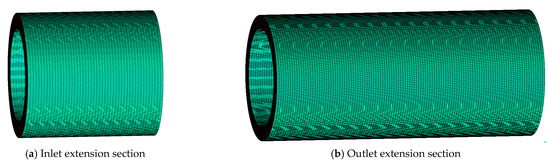 Owing to the large curvature of the multiphase pump blades, hexahedral mesh was used for the single channel of the impeller. Then, the mesh of the single channel was rotated and copied as the full channel, using ICEM software to divide the hexahedral meshes of the inlet and outlet extension sections. As is well known, the merit of hexahedral mesh division is that it can be used for mesh refinement at specific locations by adjusting the nodes, and therefore the flow situation in specific regions can be presented clearly. The computational domain meshing of the inlet and outlet extension sections and the impeller are shown in Figure 2.