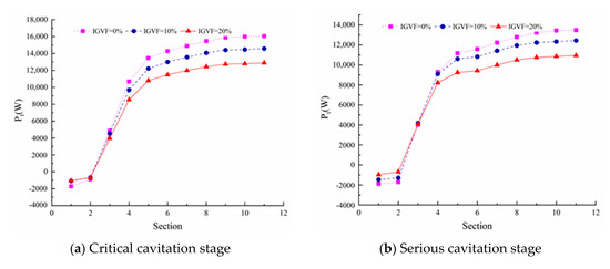 As can be seen from Figure 13, at the critical and serious cavitation stages, the IGVF had little influence on the total pressure power in the range from Section 1 to Section 4. However, the further the section was from the impeller inlet, the greater the effect of the IGVF on the total pressure power. The larger values of the total pressure power were concentrated mainly in the range from Section 5 to Section 11. Additionally, at the fracture cavitation stage, the IGVF had little effect on the total pressure power in the range from Section 1 to Section 5, while the effect became obvious from Section 5 to the outlet of the impeller, especially in the condition of the gas-liquid two phases. Furthermore, it could also be seen that with the development of the cavitation, the total pressure power through each section of the impeller assumed a decreasing trend.