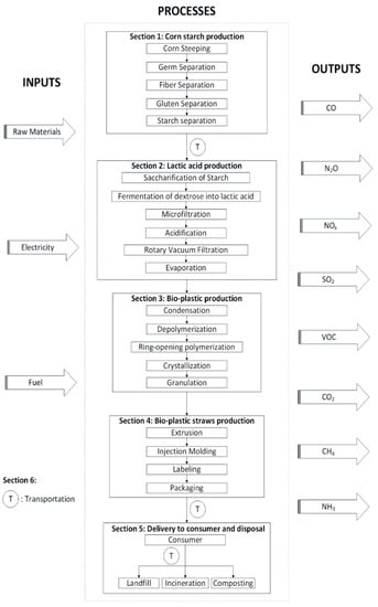 The following are available online at https://www.mdpi.com/article/10.3390/pr9061007/s1, Table S1: Equipment details of corn starch production (Section 1) based on SuperPro Designer, Table S2: Equipment details of lactic acid production (Section 2) based on SuperPro Designer, Table S3: Equipment details of bio-plastic production (Section 3) based on SuperPro Designer, Table S4: Equipment details of bio-plastic straws production (Section 4) based on SuperPro Designer, Table S5: Equipment details of delivery to consumer and disposal of bio-plastic straws (Section 5) based on SuperPro Designer, Table S6: Equipment details of paper straws production (Section 4) based on SuperPro Designer, Table S7: Equipment details of delivery to consumer and disposal of paper straws (Section 5) based on SuperPro Designer, Table S8: Process data inventory of bio-plastic straws production obtained from SuperPro Designer simulator (based on 100 drinking straws unit functional), TableS9: Process data inventory of bio-plastic straws production obtained from SuperPro Designer simulator (based on 100 drinking straws unit functional) (continue), Table S10: Process data inventory of paper straws production obtained from SuperPro Designer simulator (based on 100 drinking straws unit functional), Figure S1: Overall process flow diagram of the corn starch production (Section 1), Figure S2: Process flow diagram of the lactic acid production (Section 2), Figure S3: Process flow diagram of the bio-plastic production (Section 3), Figure S4: Process flow diagram of the bio-plastic straws production (Section 4), Figure S5: Process flow diagram of the delivery consumer and disposal of bio-plastic straws (Section 5), Figure S6: Process flow of the production of paper straws (Section 2), Figure S7: Process flow diagram of the delivery to consumer and disposal of paper straws (Section 5), Figure S8: Transportation detail for the overall process for bio-plastic straws from gate to grave, Figure S9: Transportation detail for the overall process for bio-plastic straws from gate to grave.