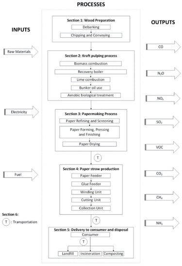 In addition, Figure 2 illustrates the overall system boundary of paper straws from the gate to the grave. The setting of the system boundaries was performed in manner similar to that of the bio-plastic straw products. The boundaries consisted of six sections of processes that started from the wood preparation, kraft pulping, papermaking, paper straw production, delivery to consumer and disposal site and transportation. The first three steps are the extraction and manufacturing processes of raw materials for paper straw production. The first step was the wood preparation, which consisted of debarking, chipping and conveying. The next step was the kraft pulping process, which consisted of three main units (energy generation, chemical recovery, and wastewater treatment). The papermaking process also involved paper refining and screening, paper reforming, pressing, finishing and drying before the production of paper straws. In the production of paper straws, there are five main units, which are the paper feeder, glue feeder, winding unit, cutting, and the collection unit. Similar to bio-plastic straws, paper straws are utilized for a single use. Therefore, the disposal methods of the bio-plastic straws, such as landfills, incineration, and composting, were included. The transportation of raw materials to the production site and the transportation of products to the consumer and the disposal site were also considered in this study. Similarly, for the bio-plastic straw, it should be noted that there was no transportation between Section 1 (wood preparation), Section 2 (kraft pulping process), and Section 3 (papermaking process) as these sections are assumed to occur at the same manufacturing facility (as shown in Figure 2).