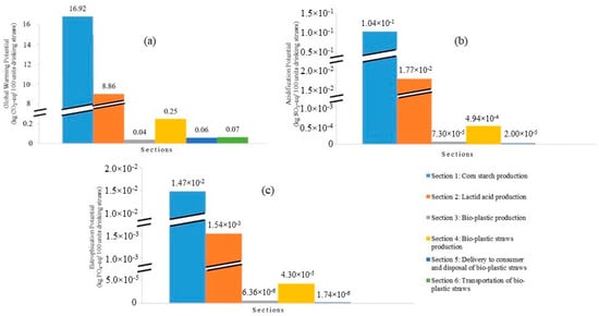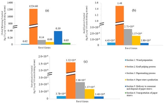 Six sections of the life cycle of bio-plastic and paper straws were studied regarding the GWP, AP and EP. The first three sections were the extraction and production of raw materials, which were the PLA for bio-plastic straws and paper for paper straws. Therefore, Sections 1–3 were grouped as one for comparison, as shown in Figure 5. Based on Figure 5a,b, paper straws contributed to a higher GWP and AP compared to bio-plastic straws concerning the extraction and production of raw materials. Section 1 for the preparation of corn starch for bio-plastic straws contributed to the higher GWP and AP compared to paper straws (Section 1: wood preparation). The production of starch from raw corn in Section 1 of bio-plastic straws generated a large portion of GWP and AP. This was due to the extraction process of starch, which involved corn steeping and germ, fiber, gluten and starch separation. On the contrary, the kraft pulping process in Section 2 of paper straws generated a large portion of GWP and AP due to higher energy generation that involved the combustion of biomasses. Moreover, the papermaking process for paper straws in Section 3 contributed to a higher GWP and AP than the polymerization of lactic acid for bio-plastic straws due to the higher electricity consumption. However, based on Figure 5c, bio-plastic straws contributed to a higher EP than paper straws, which could be ascribed to the release of NH3 during germ, gluten, and starch separation in Section 1.