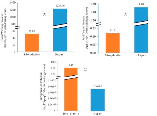 (a) GWP, (b) AP, and (c) EP of 100 units of paper straws.