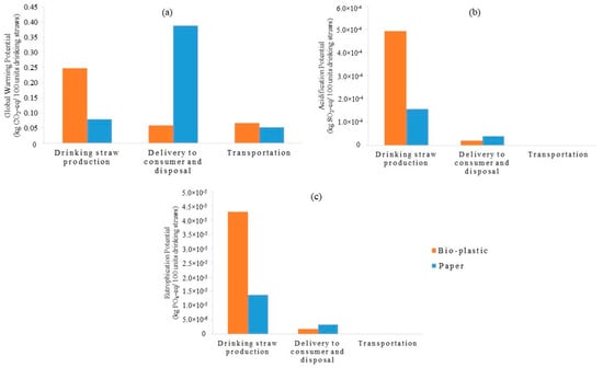 (a) GWP, (b) AP, and (c) EP of bio-plastic straws and paper straws for drinking straw production, delivery to the consumer and production and transportation sections.