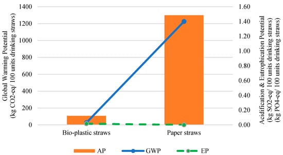 Overall, as shown in Figure 7, paper straws have a higher GWP and AP compared to bio-plastic straws. However, bio-plastic straws have a slightly higher EP than paper straws, but, generally, the EP for both types of straw is very small and insignificant compared to the GWP and AP. The GWP and AP were mainly impacted by the extraction and production of raw materials for the production of drinking straws. This included corn starch production and wood preparation for Section 1, lactic acid production and kraft pulping process for Section 2, and polylactic acid production and papermaking process for Section 3. Overall, based on the simulated case study, bio-plastic straws are found to be a better option compared to paper straws for a milder impact on the environment concerning the GWP and AP.
