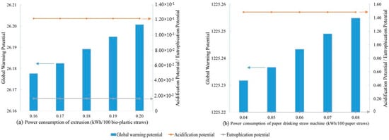 Overall GWP, AP, and EP values of (a) bio-plastic straws and (b) paper straws versus power consumption.
