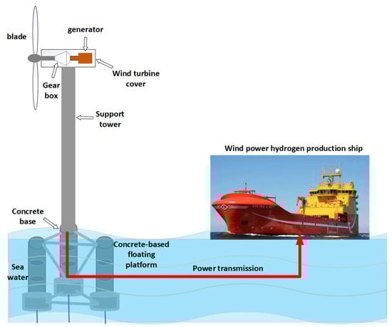 The industrial experiment intends is to use a megawatt-class floating offshore wind turbine and hydrogen production equipment to verify the optimization effect of the control system. From the perspective of the system, concrete floating foundation, offshore wind turbine, hydrogen production equipment, the theory, method, and algorithm of this research can be verified step by step. At the same time, during the verification process, the floating offshore wind power sensing device is used to obtain the real-time status information of the intelligent control operation energy conversion online, and the controller data acquisition device is used to obtain the status information related to the wind power operation and the hydrogen production process. All relevant data are collected and aggregated through the distributed information network system. The non-grid-connected hydrogen production and logistics of floating offshore wind power to be used in industrial experiments are shown in Figure 11.