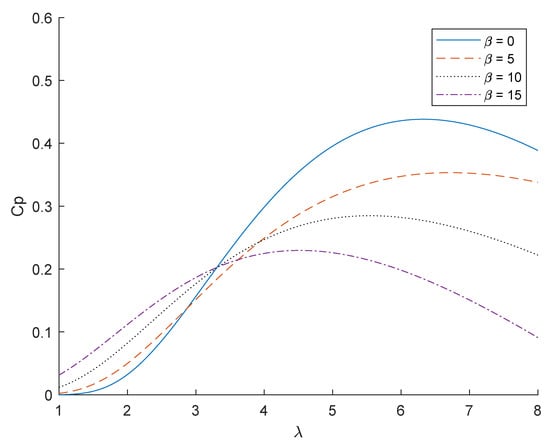 The definition of tip-speed-ratio is as the follows. The ratio of the linear velocity of the floating offshore wind turbine blade tip to the wind speed is , that is, , is the angular speed of the floating offshore wind turbine, R is the blade length, and are constants related to the characteristics of the floating offshore wind turbine. The parameters used in this study are = 0.22, = 116, = 0.4, = 5, = 12.5, and = 0.