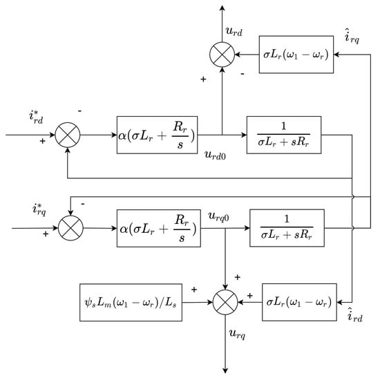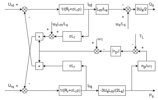 In summary, the DFIG equivalent model under stator flux orientation vector control is shown in Figure 4. By controlling the q-axis component of the rotor current, the active power of the DFIG can be controlled. By controlling the d-axis component of the rotor current, the DFIG reactive power can be controlled. Therefore, controlling the d-axis and q-axis components of the DFIG rotor current can control the output power of the generator. Since the electromagnetic torque can also be controlled by the rotor current, the DFIG speed control can be further realized.