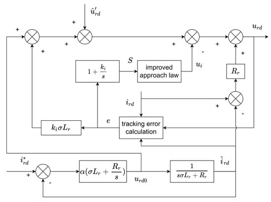 Taking the current d-axis component as an example, the structure of the proposed internal model-integral sliding model controller(IM-ISMC) is shown in Figure 8. As we can see in the figure, in the block diagram of the internal model-integral sliding model controller, an improved approach law has been used on . Moreover, the tracking error calculation has been used on error e, and the final output is .