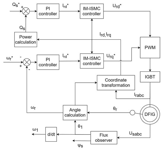 The proposed control system is based on vector control theory. The relationship between the q-axis component of the rotor current and the speed can be better described by a linear system, and it can be controlled by a PI controller. The relationship between the d-axis component of the rotor current and the reactive power is similar. The current is decoupled by the IM-ISMC controller.