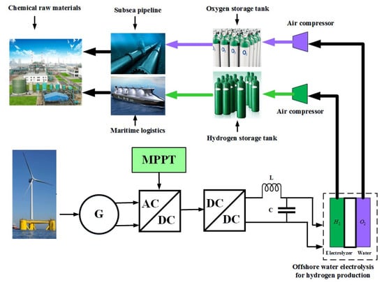 Floating offshore wind power generation technology provides new ideas for solving the problem of wind curtailment. It is of great significance for solving the problem of floating offshore wind power consumption, and development of decentralized wind power generation technology, realizing multi-channel and efficient use of renewable energy [19]. Wind power generation hydrogen is the method by using electrolysis of water energy storage. On the one hand, it can integrate hydrogen as a clean and high-energy fuel into the existing gas supply network and realize the complementary conversion of electricity to gas. On the other hand, it can directly use hydrogen energy in high-efficiency and clean technologies such as fuel cells. For example, Figure 1 shows the description of floating offshore wind turbines and power to gas [20]. Usually, the floating offshore wind turbines are located in the deep sea and have the advantages of abundant wind resources.