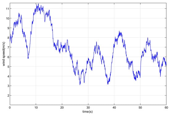 The effect of the controller is evaluated by testing the response of the control system at random wind speeds. Considering that the maximum point tracking operation of the floating offshore wind turbine is between the cut-in wind speed and the rated wind speed, the wind speeds used in the simulation are in the interval from 3 m/s to 12 m/s. It is shown in Figure 12.