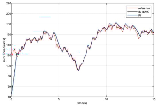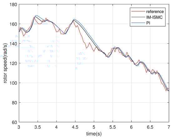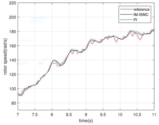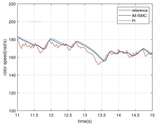Figure 13 shows the variation curve of the rotor speed under the random wind speed when the proposed controller and PI controller are used. Figure 14, Figure 15 and Figure 16 are the rotor speed in the intervals of 3 s, 7 s, 7 s, 11 s, and 11 s, 15 s, which are obtained by magnifying the three parts of Figure 13. Due to the mechanical inertia of the generator, there is a certain delay between the actual speed and the reference speed. Overall, the proposed controller has better dynamic response speed than the PI controller.