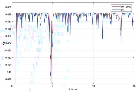 Figure 18 shows the simulation results of the power coefficient. The maximum power coefficient is approximately. The proposed controller can adjust the rotor speed according to the change of wind speed, so the power coefficient of IM-ISMC controller is larger than PI controller in general. The purpose of the maximum power point tracking is to capture wind energy as much as possible, and the offshore wind energy power coefficient can be used as the basis for determining the amount of captured offshore wind energy. This means that floating offshore wind turbine systems can capture more offshore wind energy by using the proposed controller.